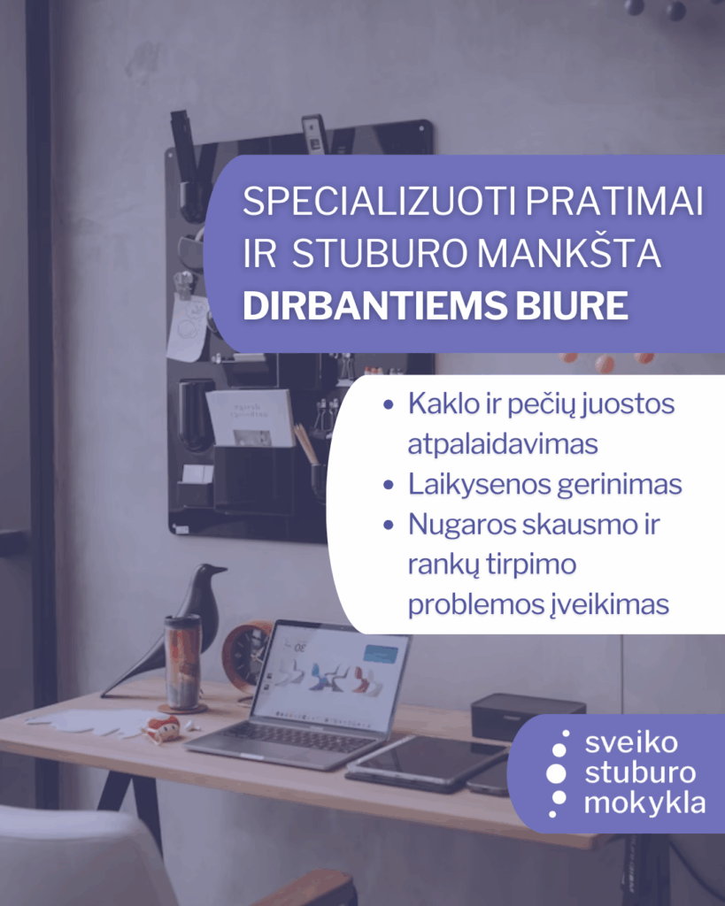 Apie paslaugą. Grupiuose užsiėmimuose atliekami saugūs ir veiksmingi pratimai laikysenos gerinimui, nugaros skausmui ir pečių juostos įtampai įveikti. Treniruotės metu mokoma taisyklingo pratimų atlikimo, koreguojama kūno padėtis, analizuojami pojūčiai ir taisomos netaisyklingos kūno segmentų padėtys. Tokiu būdu sukuriame motyvuojančią aplinką, kurioje kiekvienas biuro darbuotojas gali ne tik sportuoti drauge, bet ir spręsti savo individualias problemas.
