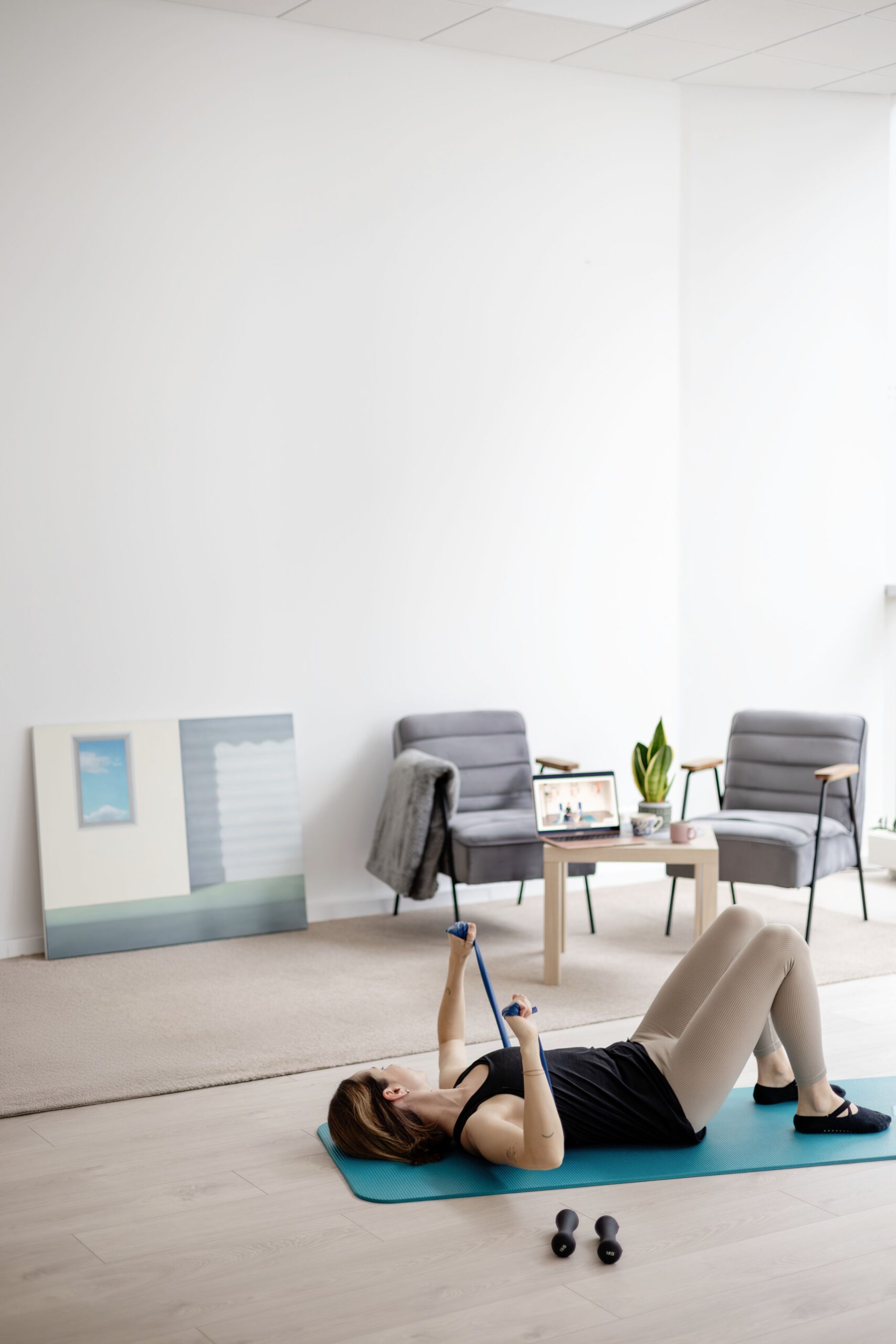 • Visas mankštų metu naudojamas priemones rasite namuose. Jums gali prireikti diržo, vandens buteliuko, pagalvės. Papildomų priemonių prireiks tik mažo minkšto kamuoliuko ir gumų.
