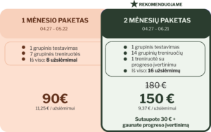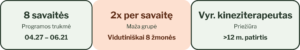 2 mėn programa, skirta raumenų tankiui didinti, kad raumuo būtų stiprus ir lankstus, o ne didelis ir „medinis.“ Treniruotės vyks grupėje (vid 8 dalyviai), 2k/ sav., vyr kineziterapeuto (>12m patirtis) priežiūroje.